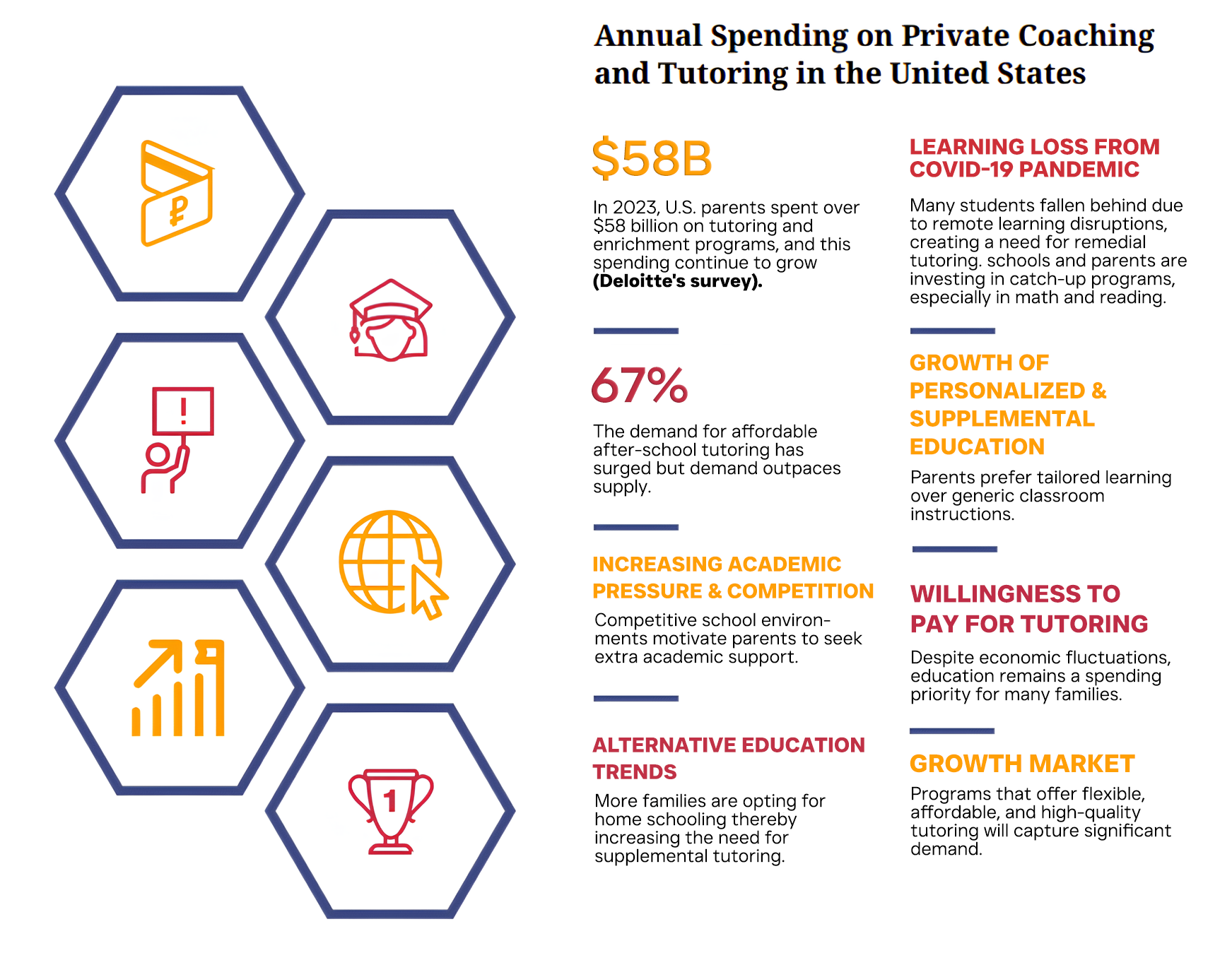 The after-school tutoring market is booming, with U.S. parents spending over $58 billion in 2023 (and growing) on tutoring and enrichment programs. Studies show that 90% of a child’s brain develops by age five, making early learning a top priority for families. With two-thirds of U.S. parents seeking affordable after-school tutoring support for their young children, the demand for quality tutoring has never been higher. PEL’s tutoring franchise offers a recession-resistant, high-reward business backed by a proven model.